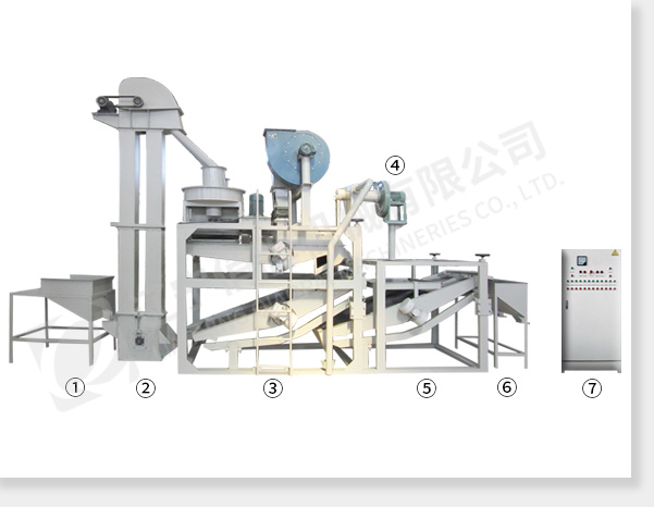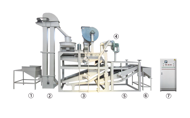 ① 上料斗②斗式提升機 ③ 脫殼、風(fēng)選、分選主機 ④ 風(fēng)力回料系統(tǒng) ⑤ 籽米復(fù)選機 ⑥ 接料斗 ⑦ 電氣控制柜