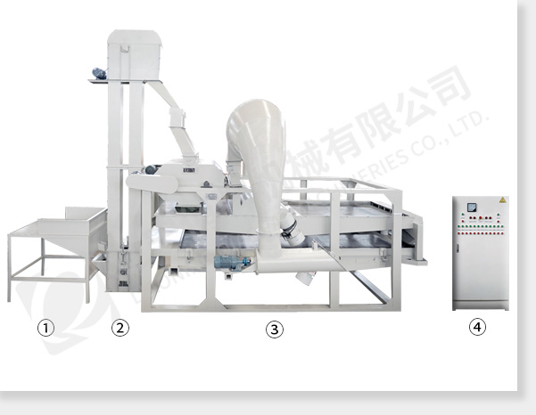 ① 上料斗② 斗式提升機 ③ 脫殼、風(fēng)選、分選主機 ④ 電氣控制柜